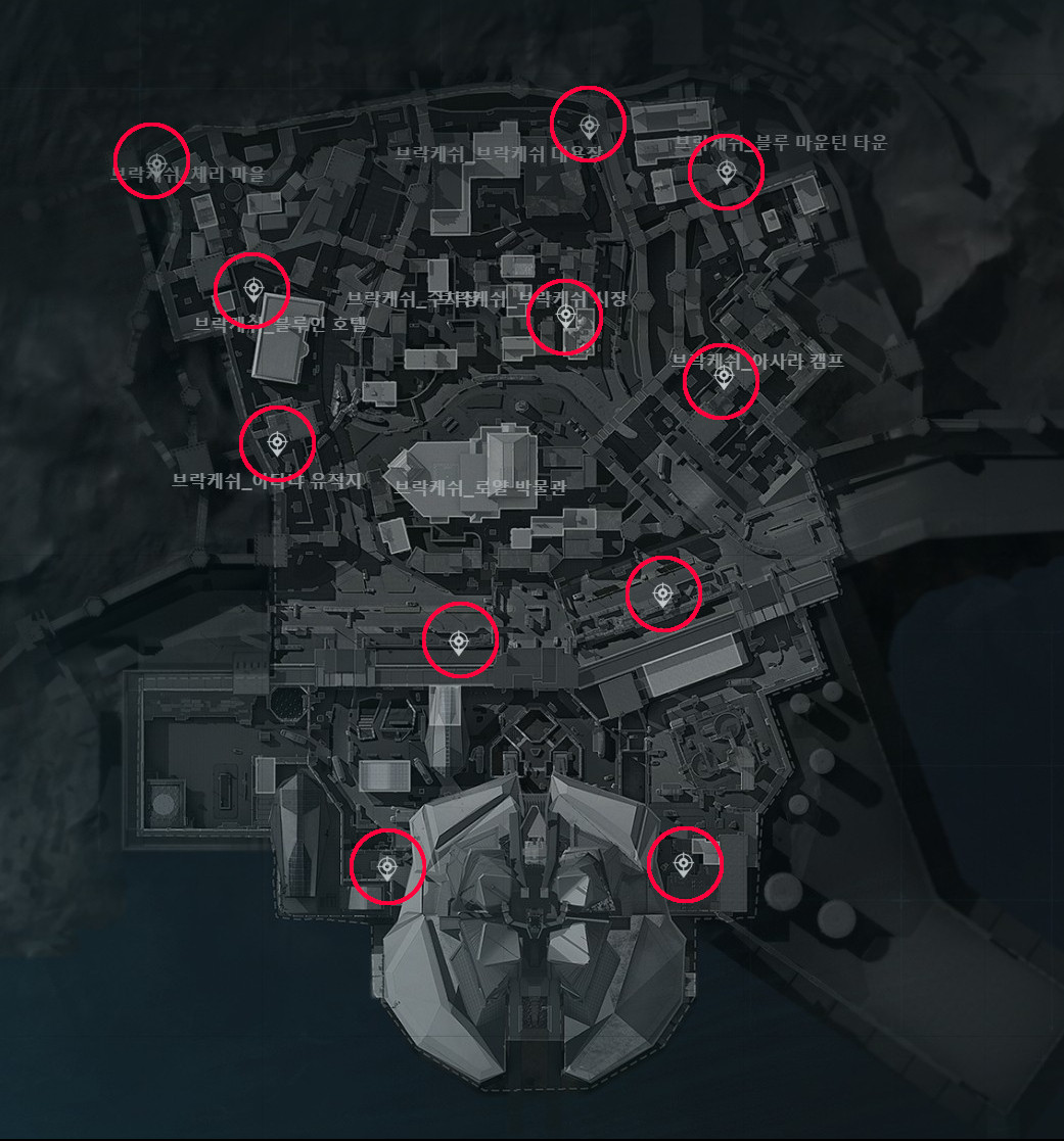 브락케쉬 맵에는 총 11곳의 스폰포인트가 존재합니다. 이곳을 잘 알아두면 초반부터 어이없게 죽는 일은 줄어드니 참고하면 좋습니다.