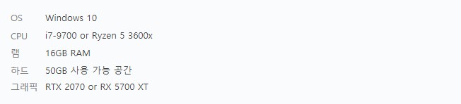 디스테라의 권장 사양은 CPU가 i7-9700 과 Ryzen 5 3600x이고, 램 16GB, GPU는 RTX 2070과 RX 5700 XT 가 되겠습니다. 신작이다 보니 비교적 최신 컴퓨터 사양을 권장하는 것 같네요.
