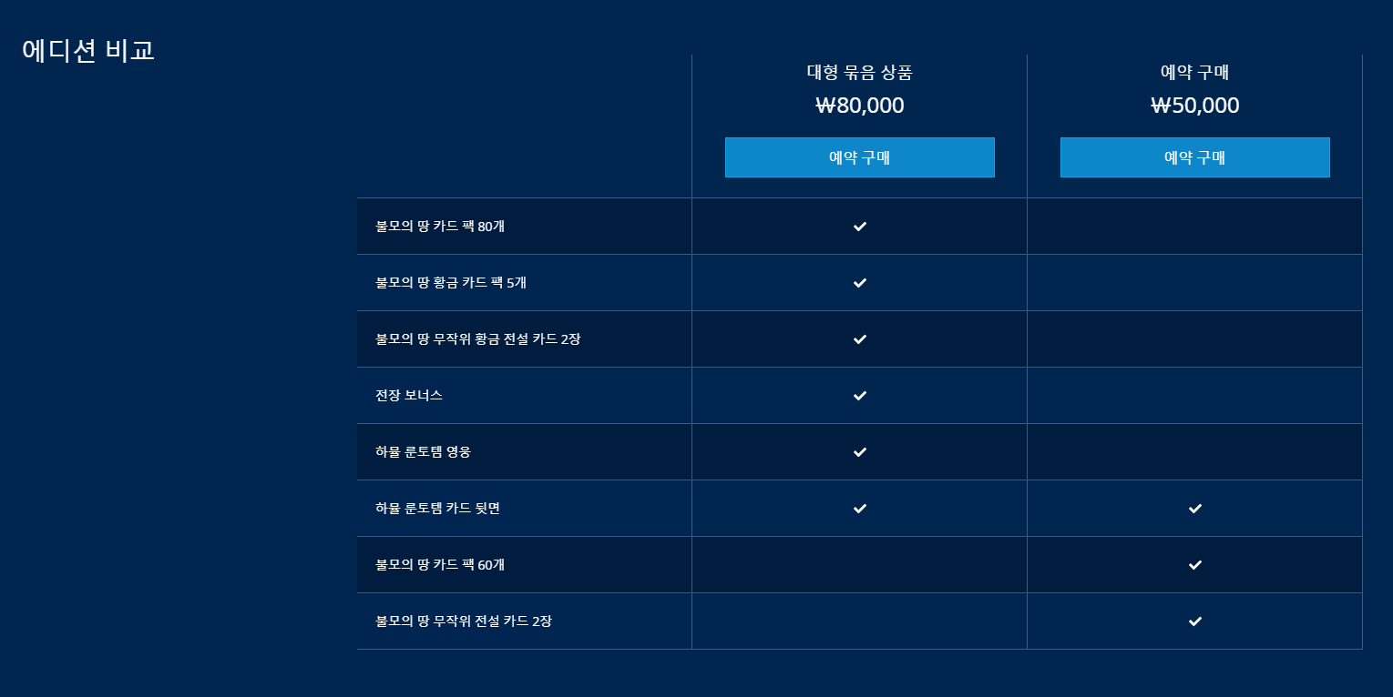 위 사진에 보이듯이 대형 묶음 상품은 불모의 땅 카드팩 80개, 불모의 땅 황금카드팩 5개, 불모의 땅 무작위 황금 전설카드 2장, 전장보너스, 하뮬 룬토템 영웅, 하뮬 룬토템 카드 뒷면을 얻을 수 있고, 일반 묶음 상품은 불모의 땅 카드팩 60개, 불모의 땅 무작위 전설카드 2장, 하뮬 룬토템 카드 뒷면을 얻을 수 있습니다.