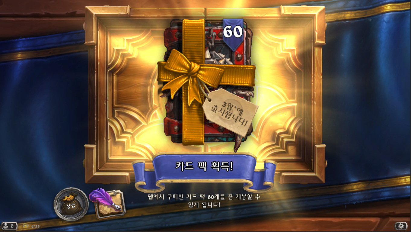 하스스톤 예약구매는 꽤 좋은 효율을 자랑하기 때문에 만약 하스스톤을 더 즐기고 싶으신 분들이라면 한번쯤 고민을 해봐도 좋습니다. 저는 하스스톤을 오랫만에 복귀했는데 마침 신규확장팩이 출시하길래 저도 예약구매를 했습니다.
